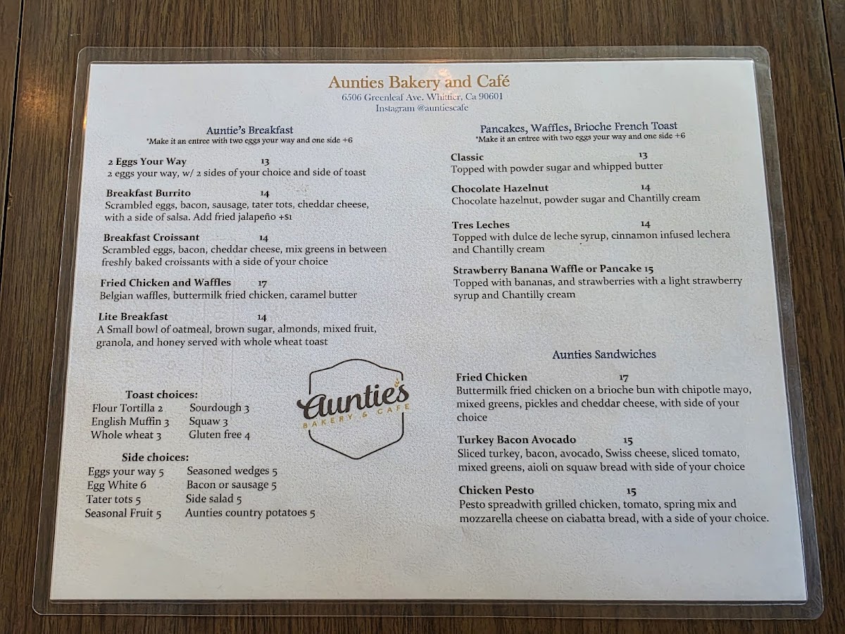 Located in the heart of Whittier, Auntie's Bakery & Cafe is a charming brunch spot that promises an unforgettable culinary experience. This cozy establishment invites you in with its warm, welcoming atmosphere, perfect for a leisurely meal with friends or family. From the moment you step through the door, you're enveloped in the scent of freshly brewed coffee and baked goods, creating a homely vibe that feels both cozy and inviting.