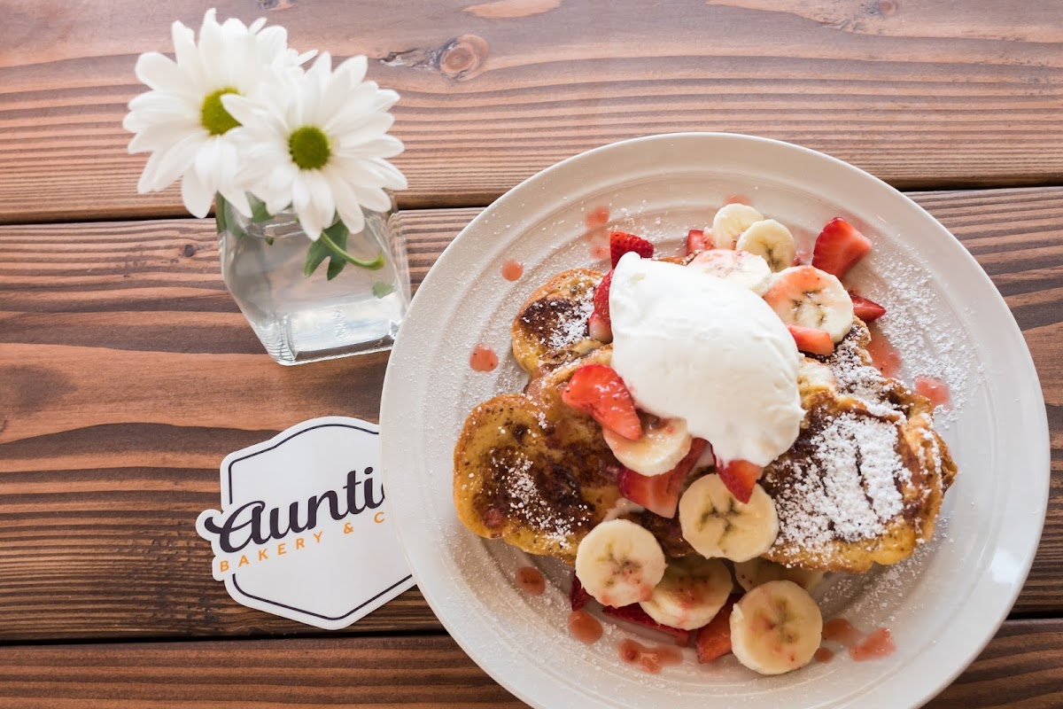 Auntie’s Bakery & Cafe specializes in delicious brunch fare, offering a diverse menu of mouthwatering options. Start your day with their famous Brioche French Toast, beautifully presented and lavished with powdered sugar and rich caramel butter for just $11. For a modern twist on a classic, try the Strawberry Banana French Toast, where sweet strawberries and bananas come together in blissful harmony, also priced at $13. If savory is more your style, indulge in the Auntie's Omelette, filled with maple bacon, spinach, and creamy avocado, or experience the depth of flavors in the Meat Lover Omelette bursting with sausage, ham, and cheddar at just $14.